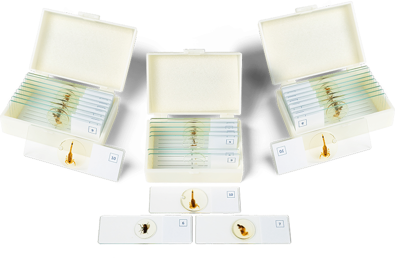 \n10 wyselekcjonowanych preparatów, dzięki którym odkryjesz cuda natury niewidoczne gołym okiem: skórę węża, sierść krowy, malutkiego skorpiona, nogę pszczoły, a nawet fragmenty jamy ustnej człowieka… i wiele więcej!